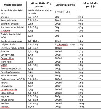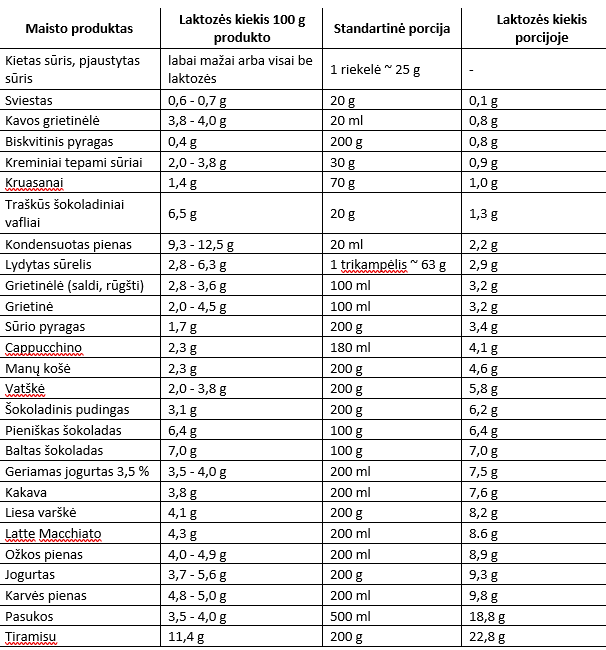 Žinoma, čia neįmanoma išvardyti visų maisto produktų, kuriuose yra laktozės. Jeigu ieškomo maisto trūksta, galite kreiptis į gamintoją. Daugelis įmonių mielai teikia informaciją apie tai, ar jų gaminyje yra laktozės ir kiek jos jame yra.