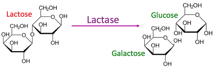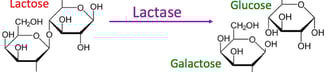 Fermentas laktazė išskaido pieno cukrų į gliukozę ir galatazę.